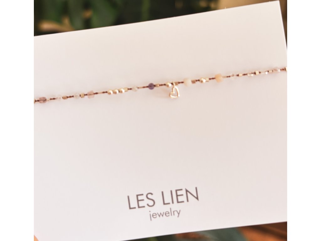 Kamínky velikosti 2 mm jsou navlečeny na hedvábíčku béžové barvy a jsou v kombinaci se srdíčkem vyrobeným ze stříbra. Ukončen je do shamballa vázání, jak my říkáme s "cancourkama":-). Velikostně se náramek přizpůsobí obvodu zápěstí 12-20 cm.