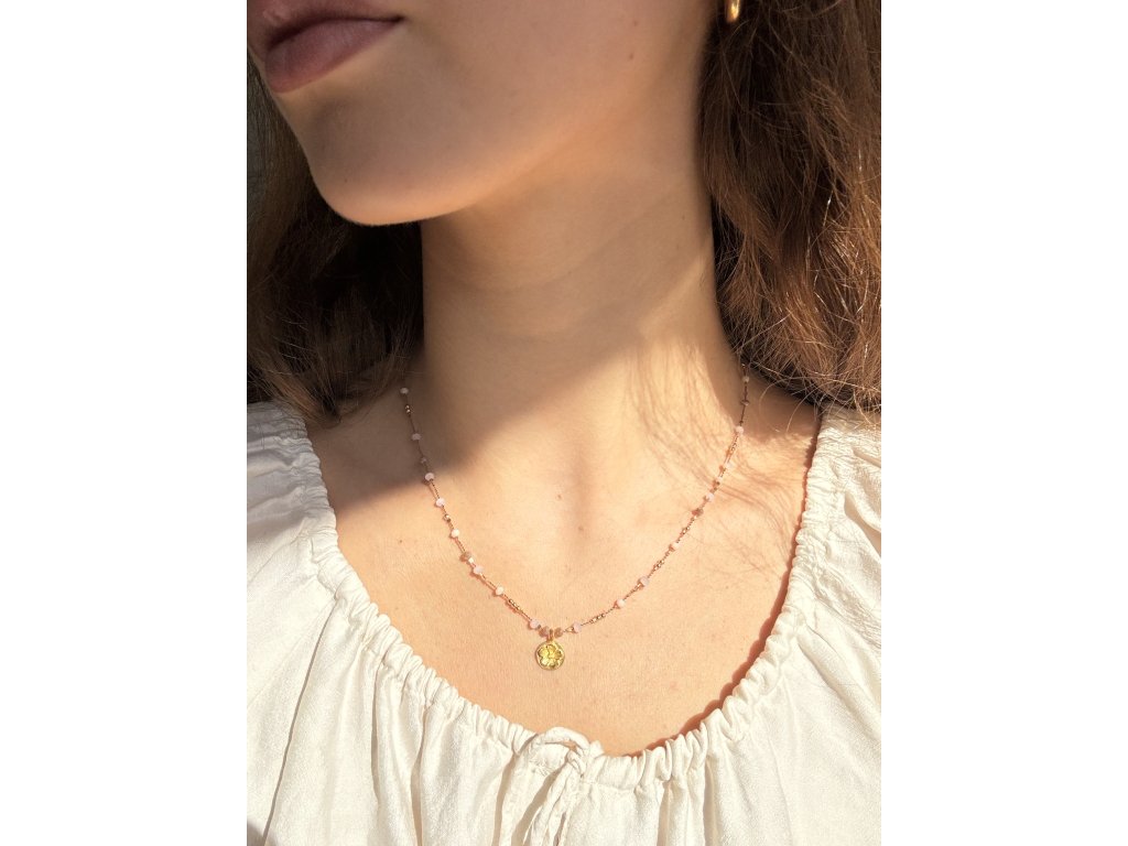 Kombinace růžových křišťálů na béžovém hedvábíčku v kombinaci s goldfilled komponenty. Zakončeno klasickým řetízkovým zapínáním..