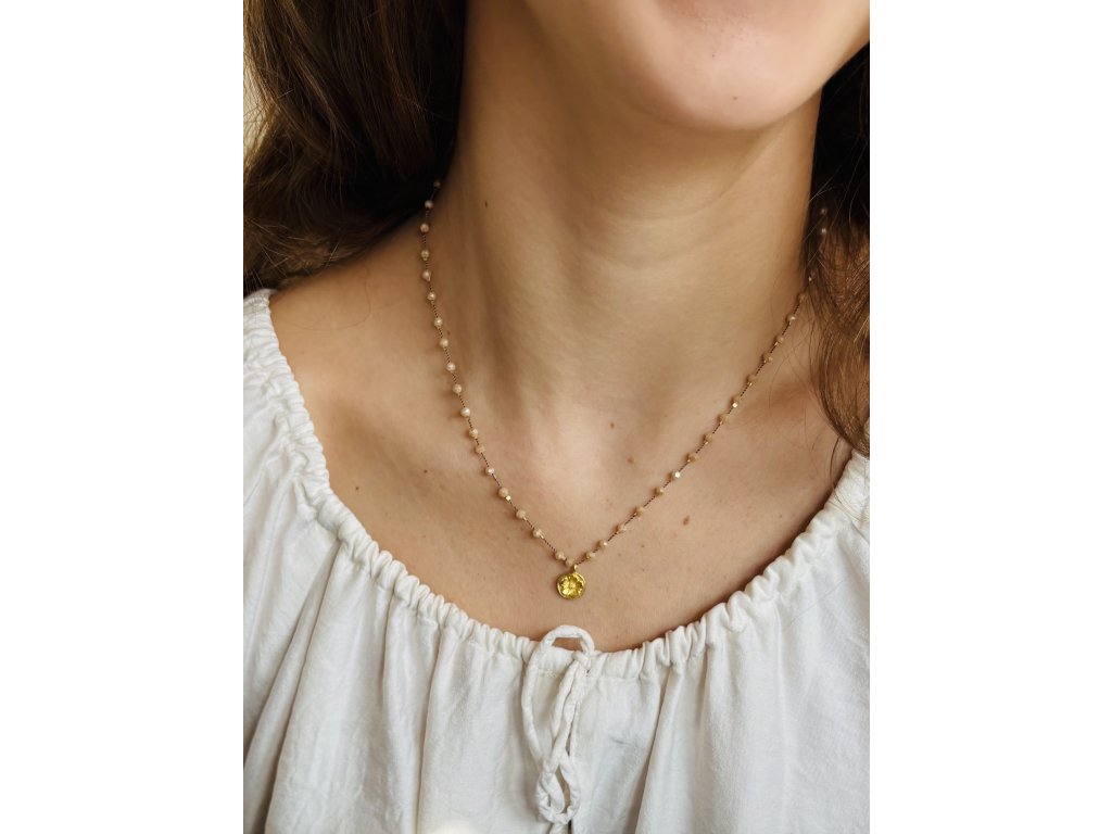 Kombinace zlatavých křišťálů na béžovém hedvábíčku v kombinaci s goldfilled komponenty. Zakončeno klasickým řetízkovým zapínáním..