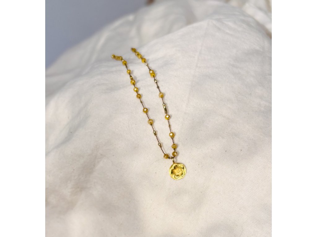 Kombinace zlatavých křišťálů na béžovém hedvábíčku v kombinaci s goldfilled komponenty. Zakončeno klasickým řetízkovým zapínáním..