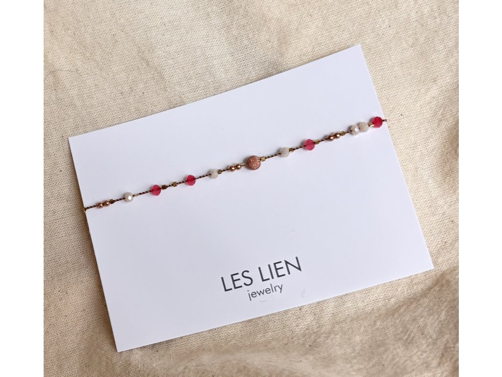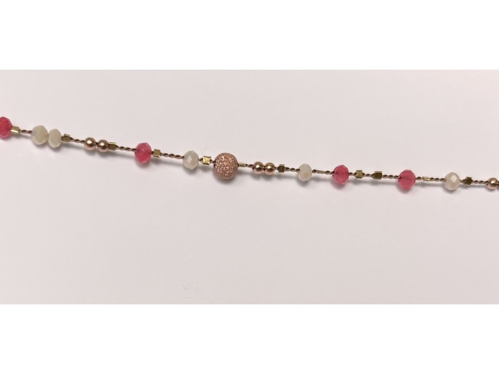 Barevné křišťálky ve velikosti 3mm jsou navlečeny na hedvábníku béžové barvy a jsou v kombinaci s rosegold filled (pozlacená mosaz) komponenty. Náramek je ukončen do shamballa vázání, jak my říkáme s cancourkama. Velikostně se přizpůsobí obvodu zápěstí 13 - 20 cm.