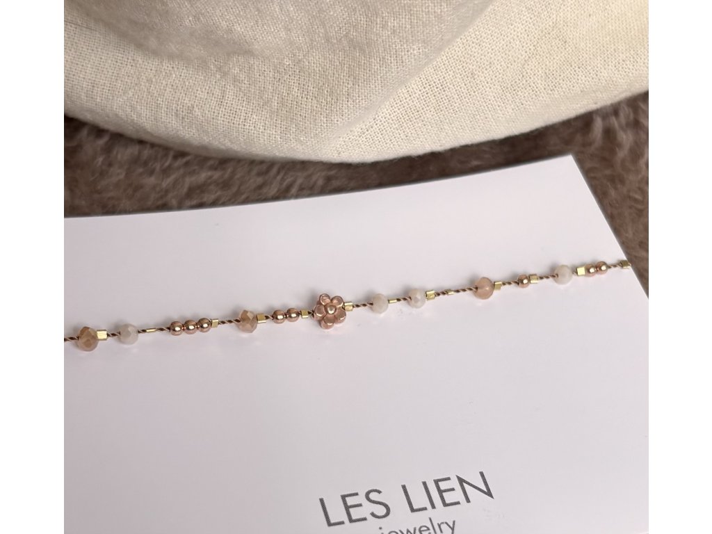 Barevné křišťálky ve velikosti 3mm jsou navlečeny na hedvábníku béžové barvy a jsou v kombinaci s rosegold filled (pozlacená mosaz) komponenty. Náramek je ukončen do shamballa vázání, jak my říkáme s cancourkama. Velikostně se přizpůsobí obvodu zápěstí 13 - 20 cm.