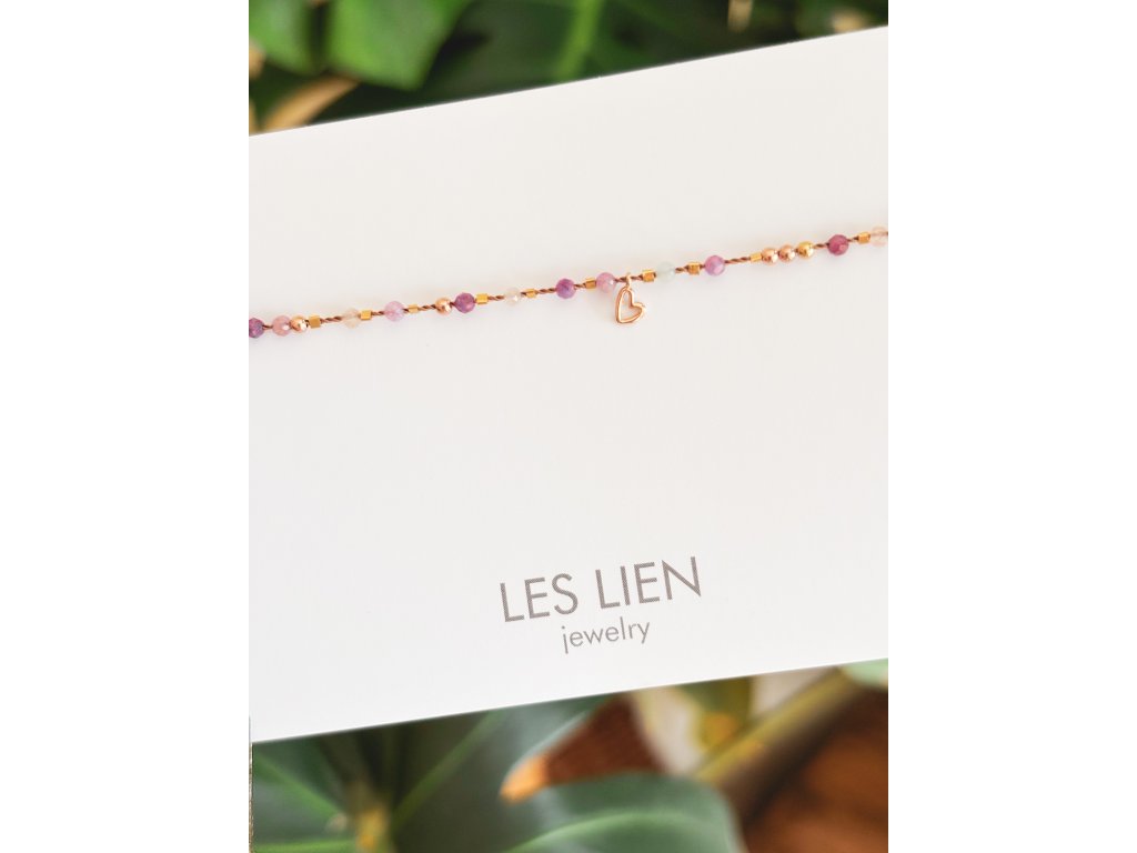 Kamínky velikosti 2 mm jsou navlečeny na hedvábíčku béžové barvy a jsou v kombinaci se srdíčkem vyrobeným z růžového zlata ryzosti 14 kt. Ukončen je do shamballa vázání, jak my říkáme s "cancourkama":-). Velikostně se náramek přizpůsobí obvodu zápěstí 12-20 cm.